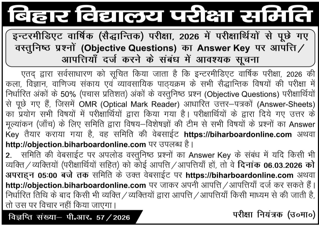 बिहार बोर्ड इंटर ऑब्जेक्टिव प्रश्नों पर आपत्ति दर्ज करने की अंतिम तिथि 06 मार्च 2026 (शाम 5:00 बजे तक) है।